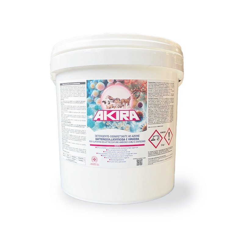 Akira è un disinfettante ad uso professionale specificamente studiato per il trattamento e la sanificazione in ambito zootecnico, veterinario e alimentare. Grazie alla sua formulazione innovativa in polvere concentrata, offre un’efficacia biocida certificata contro virus, batteri e lieviti, anche in condizioni di sporco organico e in presenza di animali.