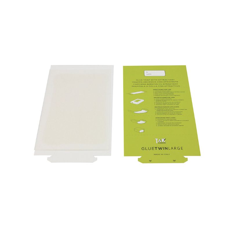Glue Twin Large è una trappola collante aromatizzata per il monitoraggio e la cattura di insetti striscianti e topi (Mus musculus domesticus) in ambienti interni. La trappola può essere utilizzata da sola o all’interno di multicattura (come la Twin Mouse) ed erogatori di sicurezza (come DUO Control Station). Può anche essere chiusa a tunnel (detta anche “a casetta”) e posizionata nei luoghi da monitorare. Glue Twin Large è uno strumento di controllo usa e getta.